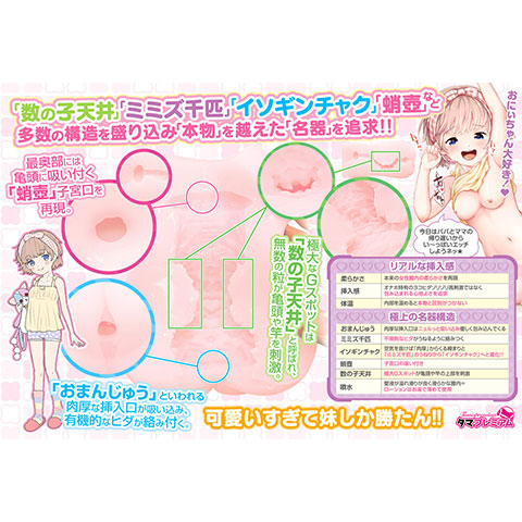 【タマプレミアム:国内自社工場製】名器と呼ばれる「数の子天井」「ミミズ千匹」「イソギンチャク」「蛸壺」など多数の構造を盛り込み「本物」を越えた「名器」を追求しました。前半は「おまんじゅう」といわれる肉厚な挿入口が吸い込み、ヒダが絡み付きます。中央直前の無数の粒が亀頭や竿を刺激する極大なGスポットは「数の子天井」と呼ばれ進んでも戻っても快感に引きずり込まれていき最奥部で一気に亀頭に吸い付く「蛸壺」は子宮口を完全再現。あっという間にかわいい妹の名器の虜に…このオナホールは「ローションの粘度と量」で感触が大きく変わります。ローションをお湯で薄めて使用すると本物の極上名器の感覚により近くなりおすすめです!(イラスト:ねりうめ)