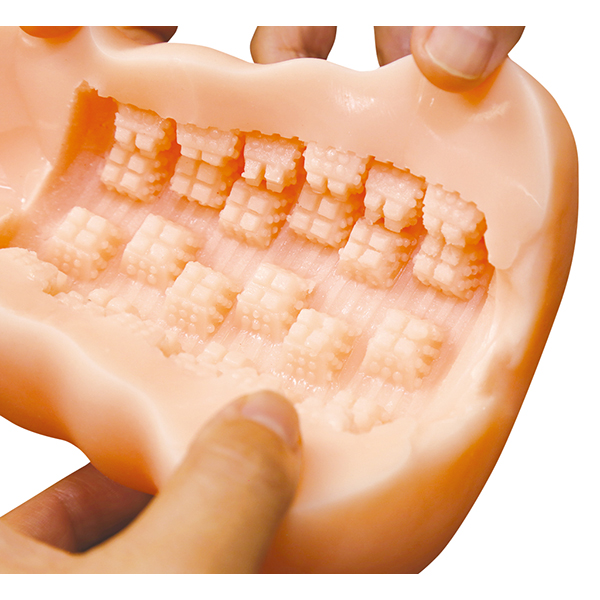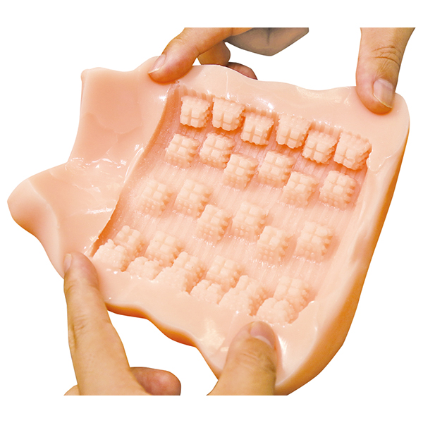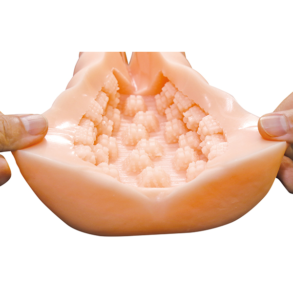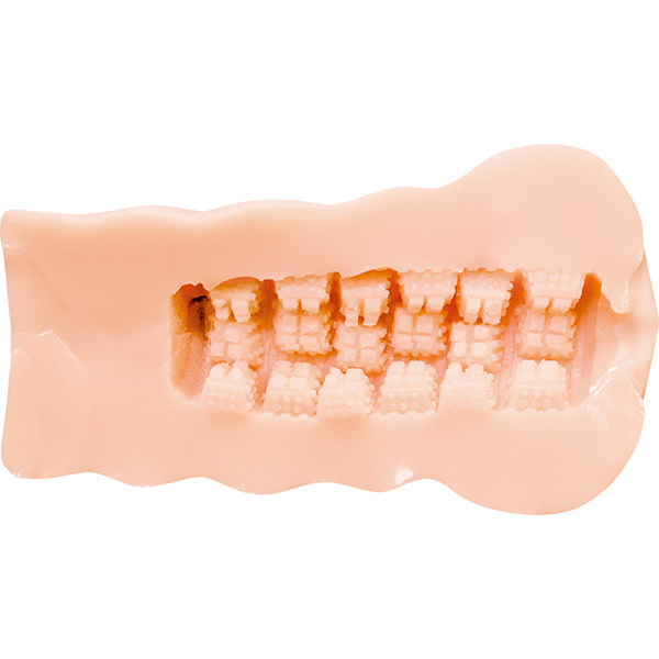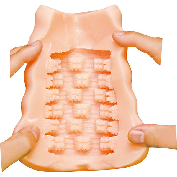 内部には、肉厚で大きめなブロック状の四角いヒダを配置しました。有機的なブロックヒダがゴリゴリとしっかりとした刺激を与えます。大きめのオウトツが、しっかりと摩擦して気持ちいい高刺激オナホールです。デコボコの大きな四角を掻き分ける、今までにない複雑な新感覚な感触をご堪能ください。